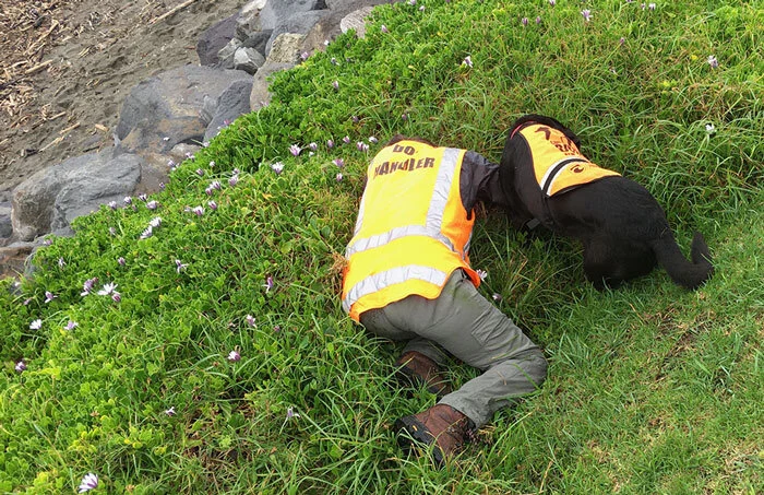 Rua always wears a lightweight muzzle so he can’t hurt any wildlife. He is trained to indicate the location when asked to ‘find’.