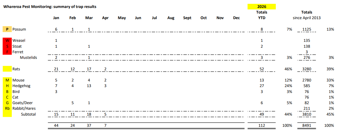 As we have often said, the good thing is that the Whareroa team will be out there month for month checking and baiting the more than 200 box traps, leg-hold traps and the automatic AT220’s (as well as the occasional shooting session to cull hares, rabbits, goats and or deer) and making life difficult for the pests out there (Thank you Animal Pest Control Team!!)